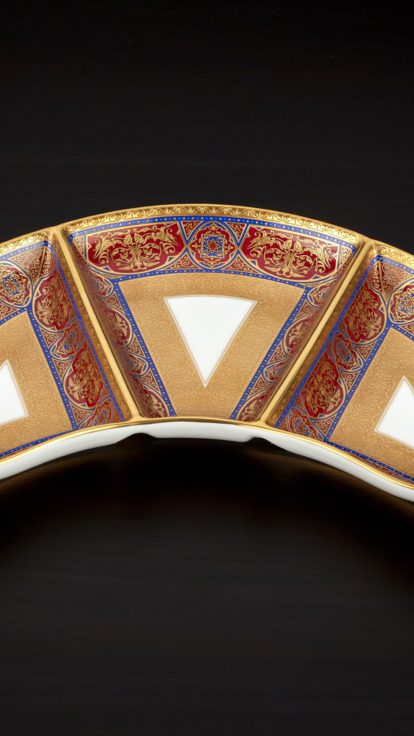 Capturing the “Sultan of Samarkand” the enchanted king of One Thousand and One Nights, the gem of the East’ this truly majestic design is of exquisite taste. Stylised mosaics are highlighted in raised 24 carat gold which are then delicately in-filled within a crimson and indigo blue palette. The illustration shows the china plate with co-ordinating gilded crystal and silverware ornately engraved and inlaid with 22-carat gold and individually inset lapis lazuli semi-precious stones.